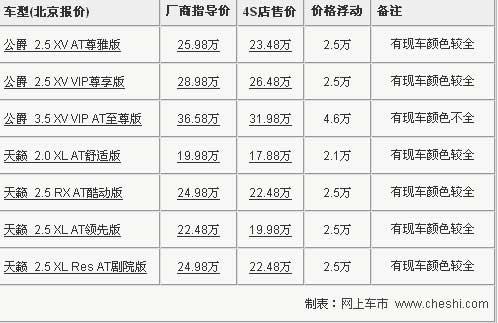 中級豪華車的標桿-------新天籟全系采用了CVT無級變速箱,連續(xù)的動力輸出雖然少了駕駛激情,但順暢的動力輸出帶來了平順的駕乘感受,日產系列發(fā)動機不錯的抑噪能力也是很有群眾口碑的,配合新天籟寬大舒適的座椅,無論是駕駛還是乘坐,都是一種愜意的享受,商用和家用兩者皆可。近日根據(jù)網上車市價格監(jiān)測系統(tǒng)顯示,目前購買天籟最高可以享受到4.7萬元的價格優(yōu)惠,最低售價僅為17.88萬,具體車型售價見下表: