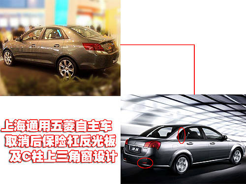 上海通用五菱自主轎車采用一體式設(shè)計,替代了上海通用別克凱越的分體社尾燈,顯得更加飽滿。此外,別克凱越后保險杠上的反光板和C柱上的三角窗設(shè)計,均沒有出現(xiàn)在上海通用五菱自主轎車。