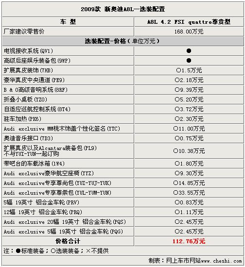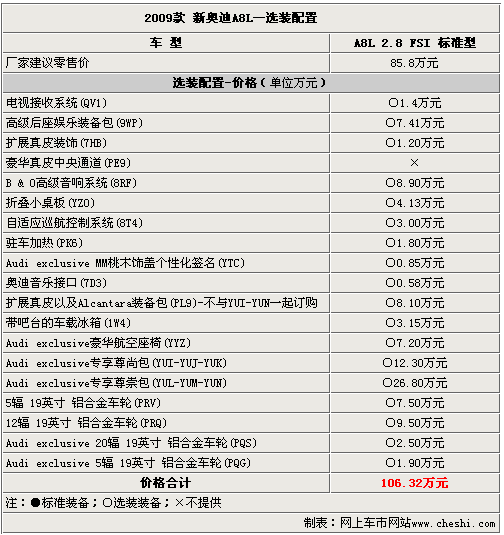以上的選裝配置需要在預訂車輛前選擇好,經(jīng)銷商會根據(jù)客戶的訂單向廠家發(fā)送配置代碼。09款奧迪A8L的選裝配置十分豐富,完全可以滿足對配置有需求消費者的“苛刻”要求。當然,這些配置也需要不菲的金錢才可以擁有,究竟哪些配置適合有品位懂得享受的您呢?