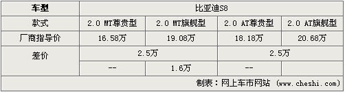 比亞迪S8是國內(nèi)首款具有硬頂敞篷技術(shù)的轎跑車,是比亞迪又一款高端化戰(zhàn)略產(chǎn)品。S8凝聚了比亞迪多年成功的轎車研發(fā)經(jīng)驗(yàn),融合了國際汽車制造領(lǐng)域最尖端的汽車科技,全面展現(xiàn)了比亞迪汽車強(qiáng)大的技術(shù)實(shí)力。其中手動(dòng)擋或自動(dòng)擋的尊貴型與旗艦型差價(jià)為2.5萬,而手動(dòng)擋與自動(dòng)擋車型之間的差價(jià)為1.6萬元。