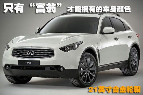 英菲尼迪FX“百萬富翁版”以F50S運(yùn)動(dòng)版為基礎(chǔ)開發(fā)而成,這款車型僅有獨(dú)特的月光白與曜石黑色兩種專屬的車身顏色可供選擇;疑21英寸“渦輪”造型輕合金輪轂是整車造型的亮點(diǎn),更顯霸氣。