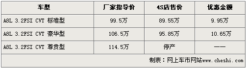據(jù)4S店銷售人員介紹,奧迪A8L 3.0車型已于日前正式上市,但由于該車型為原裝進(jìn)口,所以預(yù)訂周期為6個(gè)月,且訂金為10萬元。另據(jù)該銷售人員表示,目前奧迪A8L 3.2車型除尊貴型停產(chǎn)外,其余兩款車型均有大幅優(yōu)惠。其中奧迪A8L 3.2優(yōu)惠幅度達(dá)10.65萬元,而入門級(jí)車型優(yōu)惠后售價(jià)僅為89.55萬。