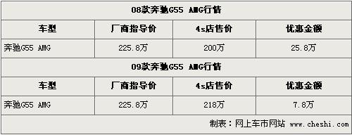 根據(jù)北京奔馳4S店銷售人員介紹,目前店內(nèi)可以接受09款奔馳G55 AMG的預(yù)訂,訂金為10萬元,并且近期預(yù)訂奔馳G55 AMG的消費(fèi)者可以得到7.8萬元的優(yōu)惠,經(jīng)優(yōu)惠后售價(jià)從225.8萬元下降到了218萬元。銷售人員還介紹,08款的奔馳G55 AMG還有少量的庫存車,并且有高達(dá)25.8萬元的優(yōu)惠,經(jīng)優(yōu)惠后08款的售價(jià)降到了200萬元。