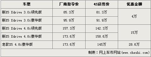 寶馬全新X5于去年7月上市,此車的上市為競(jìng)爭(zhēng)激烈的高性能運(yùn)動(dòng)型多功能車(SAV)細(xì)分市場(chǎng)再次在操縱靈活性方面制定起新的標(biāo)準(zhǔn)。全新寶馬共有3.0L及4.8L兩個(gè)排量選擇,價(jià)格區(qū)間為83.7萬(wàn)元-173.6萬(wàn)元。近日根據(jù)網(wǎng)上車市價(jià)格檢測(cè)系統(tǒng)顯示:寶馬X5全系最高優(yōu)惠金額達(dá)28.6萬(wàn)元,具體詳情請(qǐng)看下表: