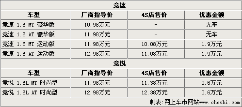 青年蓮花競速從上市后已經(jīng)有兩次官方降價,總降幅達(dá)兩萬元。據(jù)青年蓮花4S店銷售人員介紹,競速目前只有運動版兩款車型銷售,這兩款車型都可以優(yōu)惠1.9萬元,最低售價僅為10.08萬元。而剛上市時間不就的競悅目前也有6000元的優(yōu)惠幅度,而4S店銷售人員表示,如果到店還可以有更多的優(yōu)惠政策。
