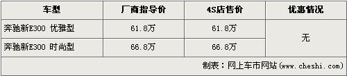 據(jù)北京奔馳4s店銷售人員介紹,奔馳新E級先期上市的車型為E300優(yōu)雅型和E300時(shí)尚型,售價(jià)分別為61.8萬元和66.8萬元。前期預(yù)訂新E級的車主已經(jīng)可以到店內(nèi)提車,近期欲購買奔馳新E級的消費(fèi)者需交1萬元訂金,9月份才可提車。