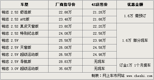 作為一款以運(yùn)動(dòng)著稱(chēng)的后驅(qū)中級(jí)車(chē),銳志在性能以及操控各方面表現(xiàn)都令人滿(mǎn)意,尤其是獨(dú)具個(gè)性的改裝潛力,讓很多癡迷運(yùn)動(dòng)的車(chē)迷們找到了充分的駕駛樂(lè)趣。筆者通過(guò)經(jīng)銷(xiāo)商處了解到,明年4月豐田將推出新款銳志車(chē)型,最快要在6月份后可以購(gòu)買(mǎi)到,另外現(xiàn)款車(chē)型最高優(yōu)惠現(xiàn)金1.6萬(wàn)元。具體車(chē)型行情如下: