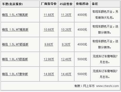 據(jù)廣汽本田4S店銷售人員介紹,目前鋒范有3千元-5千元不等的優(yōu)惠,另外近期購車還將贈(zèng)送部分裝飾,包括腳墊、座套等可供消費(fèi)者選擇,F(xiàn)車方面主要以1.5L車型為主,部分顏色及1.8L車型需要提前預(yù)訂,預(yù)訂訂金為1000元,7月左右可以提到現(xiàn)車。北京地區(qū)各4S店由于訂單不同,各店銷售的現(xiàn)車顏色有所不同。