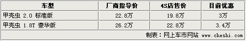 據(jù)4S店銷(xiāo)售人員介紹:目前甲殼蟲(chóng)硬頂版本車(chē)型共有2款,2.0升與1.8T車(chē)型店內(nèi)均有現(xiàn)車(chē),2.0升車(chē)型目前顏色較為齊全,有綠色、紅色、米色、黑色、藍(lán)色車(chē)款,最高可優(yōu)惠3萬(wàn)元,1.8T車(chē)型指導(dǎo)價(jià)改為26.2萬(wàn)元,優(yōu)惠后僅為22.8萬(wàn)元。