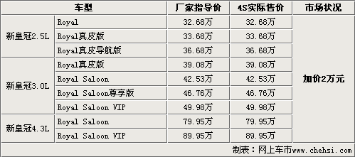 一汽豐田旗下旗艦車型新皇冠于昨日正式發(fā)布,新皇冠分別搭載了2.5L、3.0L和4.3L引擎,共計(jì)9款車型,售價(jià)32.68萬(wàn)-89.95萬(wàn)元;使谧鳛橐黄S田旗下旗艦版車型,自進(jìn)入國(guó)內(nèi)市場(chǎng)以來(lái)就一直擁有較好的口碑,新皇冠無(wú)論在性能還是配置方面,較老款都有很大的提升。所以自打在國(guó)內(nèi)一亮相,就備受中國(guó)消費(fèi)者的關(guān)注。同時(shí)我們也從北京地區(qū)一汽豐田4S店了解到,目前4S店內(nèi)均沒有展車,第一批車輛要到12月20號(hào)左右才會(huì)到店,消費(fèi)者最早要到明年1月才能提到現(xiàn)車,而且要加價(jià)2萬(wàn)元現(xiàn)金。具體車型售價(jià)見下表: