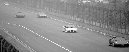 昨日上午11時許,記者在賽車場約1公里外,就聽見引擎巨大的轟鳴聲。走近后,只見一輛寶藍色法拉利跑車從賽道直行路段呼嘯而過,一輛紅色豪車接踵而至,緊接著是一輛黃色豪車。直道加速,彎道變速。飛馳的豪車引起觀眾陣陣驚呼。賽道內(nèi)側(cè)空地,10余輛顏色款式各異的豪車整齊停放。車隊后方不遠處,停著一輛急救車。賽車場一名工作人員說,上午9時許,就陸續(xù)有豪車來到賽車場。