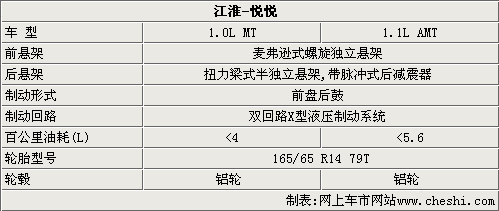 在底盤方面,江淮悅悅的前懸架采用麥弗遜式獨(dú)立懸架,后懸架為扭力梁式半獨(dú)立懸架。制動(dòng)系統(tǒng)則采用前盤后鼓式,并采用雙回路X型液壓制動(dòng)系統(tǒng)。另外,悅悅兩款排量的新車都采用全鋁輪轂,并采用165/65 R16尺寸的輪胎。