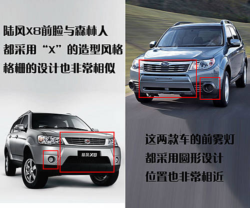 陸風(fēng)X8的前臉與森林人非常相似,都采用“X”型的設(shè)計(jì)風(fēng)格,而且前臉進(jìn)氣格柵的風(fēng)格與森林人也非常相似。除了這些,陸風(fēng)X8還配備了前霧燈,并采用圓形的設(shè)計(jì)風(fēng)格,這也與森林人的造型相近。