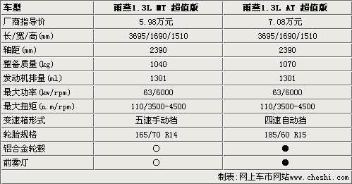 從圖表中可以看到,雨燕的兩款超值版價(jià)格相差1.1萬(wàn)元,在性能和配置方面都有一些不同之處。首先,雨燕超值版的車(chē)身尺寸和軸距都沒(méi)有任何變化,但自動(dòng)擋車(chē)型的整備質(zhì)量比手動(dòng)重30kg。另外,在動(dòng)力搭配相同的情況下,雨燕1.3L AT超值版匹配四速自動(dòng)變速箱,所以加速和高速行駛的表現(xiàn)不會(huì)超過(guò)手動(dòng)擋車(chē)型。不過(guò)雨燕1.3L AT 超值型采用了15寸輪胎和鋁合金輪轂,而且還配備了手動(dòng)擋所沒(méi)有的前霧燈,其他配置方面并無(wú)差異。