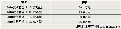 2010款三菱歐藍(lán)德共推出四款車型,分為2.4L和3.0L兩種排量,其中2.4L舒適型為兩驅(qū)版,售價(jià)26.2萬元。其他三款車型均為四驅(qū)版,售價(jià)29.8萬元、33.8萬元和36.2萬元。據(jù)悉,目前2010款歐藍(lán)德只有少數(shù)展車到店,大部分車型現(xiàn)在都只能預(yù)訂,大概需要七個(gè)工作日即可提車。