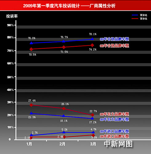 中新網(wǎng)4月24日電 日前,中國質(zhì)量協(xié)會(huì)用戶委員會(huì)、車人網(wǎng)聯(lián)合發(fā)布了2009年一季度中國汽車產(chǎn)品質(zhì)量與服務(wù)質(zhì)量分析報(bào)告。統(tǒng)計(jì)顯示,相比去年同期,合資品牌車型的投訴增加較快,進(jìn)口車投訴略有增加,自主品牌車型的投訴呈現(xiàn)遞減趨勢。