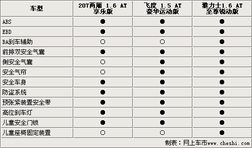 我們選取的三款車型均是各自車款中的高配車型,所以各自的安全配置都比較全面。ABS 、EBD、前排安全氣囊均為這三款車型的標(biāo)準(zhǔn)配置。同時(shí)安全車身、預(yù)緊安全帶、高位剎車燈也保證了它們的行駛安全,但是仔細(xì)看下來(lái),標(biāo)致207的裝備似乎比較單薄,沒(méi)有配備策安全氣囊和安全氣簾。豐田雅力士裝配了BA剎車輔助系統(tǒng),該系統(tǒng)利用傳感器感應(yīng)駕駛者對(duì)制動(dòng)踏板踩踏的力度與速度大小,從而使制動(dòng)力快速產(chǎn)生,減少制動(dòng)距離。在兒童保護(hù)方面,三款車型均配有兒童安全門鎖,雅力士還配備了后排兒童座椅固定裝置。