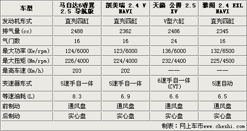 通過(guò)以上橫向?qū)Ρ,可以看出四款車的排量都?.4這個(gè)區(qū)間,但是在發(fā)動(dòng)機(jī)形式方面卻完全不同。馬自達(dá)6睿翼、雅閣和凱美瑞都為直列四缸發(fā)動(dòng)機(jī),天籟•公爵則采用的是被評(píng)為十佳的VQ發(fā)動(dòng)機(jī)(V型六缸)。值得一提的是這四款車型都具備了日系發(fā)動(dòng)機(jī)傳統(tǒng)的特點(diǎn):性能良好、油耗經(jīng)濟(jì)。由于天籟•公爵采用的是V型六缸發(fā)動(dòng)機(jī),所以在動(dòng)力輸出方面相比另外三款車型要明顯突出。在變速箱方面,天籟•公爵配備的是全新6速手自一體CVT變速箱,相對(duì)另外三款車型的變速器來(lái)說(shuō)天籟•公爵則更可以體驗(yàn)到駕駛的樂(lè)趣。四款車型的制動(dòng)系統(tǒng)都是前通風(fēng)盤后實(shí)心盤。