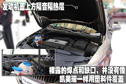 斯柯達(dá)昊銳的發(fā)動(dòng)機(jī)艙布局也是比較整齊,位于發(fā)動(dòng)機(jī)蓋上方的隔音隔熱層非常厚實(shí)面積也很大。但是記者注意到在前翼子板內(nèi)側(cè)制造中留下的工藝孔并沒有像凱美瑞一樣用塑料件覆蓋。