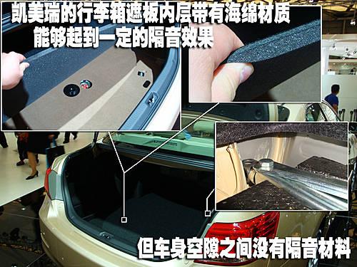 我們看到凱美瑞的行李箱與備胎之間的蓋板上設(shè)計(jì)了非常厚的一層隔音材料,這部分設(shè)計(jì)能夠較好的實(shí)現(xiàn)阻隔行駛中噪音的作用。但是在行李箱內(nèi)部覆蓋件與車身之間我們同樣沒(méi)有看到任何隔音材料的填充。