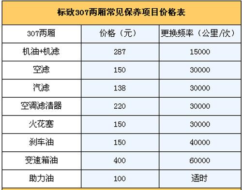 5.保養(yǎng)費: 我們向標(biāo)致4S店售后服務(wù)人員咨詢過,他們說307一大優(yōu)勢是保養(yǎng)周期比較長,1.5萬公里才需要保養(yǎng)一次,是同級車型中保養(yǎng)花費最低的。通常新車首保在7500公里時進行,以后每1.5公里保養(yǎng)一次。第二次1.5萬公里時的常規(guī)保養(yǎng)(更換機油機濾)需花費287元;3萬公里保養(yǎng)(更換機油機濾+空濾+空調(diào)濾芯+汽濾+火花塞)為795元;4.5萬公里保養(yǎng)(更換機油機濾)花費287元;6萬公里保養(yǎng)(更換機油機濾+空濾+空調(diào)濾芯+汽濾+火花塞)為795元。