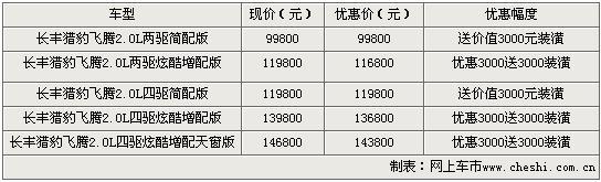 飛騰采用三菱最新研制的超級四輪驅動系統(tǒng),使飛騰全身充滿活力。具有強勁的動力性能和較好的平穩(wěn)性能。并且,具有低燃耗等優(yōu)點。近日根據(jù)網(wǎng)上車市價格監(jiān)測系統(tǒng)顯示,目前上海地區(qū)購買長豐獵豹累計最高優(yōu)惠6000元。具體車型售價見下表:
