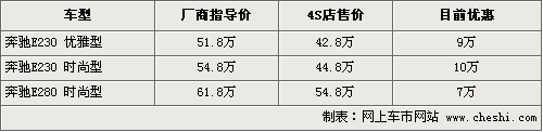 據(jù)4S店銷售人員介紹,目前奔馳E級現(xiàn)車都較為緊張,多數(shù)是訂單式的銷售方式。因為E級將推出改款車型,所以目前的優(yōu)惠幅度相對較大,其中E230時尚型最高優(yōu)惠達到了10萬元,E230降幅也在9萬元,E280時尚型優(yōu)惠7萬元后售價僅為54.8萬元。目前只有個別4S店內有少量銀色和黑色現(xiàn)車供應,其他店均需要訂車。對想購買E級車的消費者而言,現(xiàn)在出手是最好的時機。