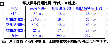 僅從配件的費(fèi)用來看,帕薩特領(lǐng)馭1.8T和榮威750的價格優(yōu)勢明顯,考慮到上海大眾保養(yǎng)工時收費(fèi)較高,綜合看來,榮威750使用3年在保養(yǎng)費(fèi)用的支出上最具優(yōu)勢,而凱美瑞240G不但配件價格昂貴,據(jù)了解保養(yǎng)一次的工時收費(fèi)在200元左右,是三款車型中最貴的,日常使用成本較高。