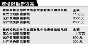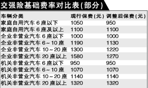 目前,初步方案定為:在12萬元責(zé)任限額下,交強(qiáng)險(xiǎn)基礎(chǔ)費(fèi)率按車型不同將有不同幅度的下調(diào),8大類42種車型中將有16種下調(diào)基礎(chǔ)費(fèi)率,降幅從5%~33%不等,其中普通家庭用車的交強(qiáng)險(xiǎn)保費(fèi)擬由現(xiàn)行的1050元下調(diào)至950元,降幅9.5%,而賠償限額提高一倍,從現(xiàn)行6萬元提高至12萬元。