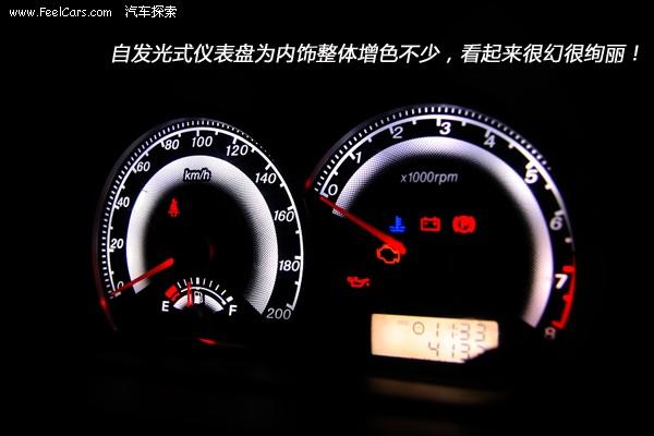 比較夢幻的是絢麗的儀表。黑色的表底下白色泛出的刻度以及紅色的指針很是顯眼。面積雖然不大,但為整個內(nèi)飾都呈現(xiàn)出一種比較有檔次的效果。上面的擋板保證了其自發(fā)光的設(shè)定時刻都不會因為陽光的原因而影響讀取信息,當(dāng)然如果面積更大一些的話,那感覺就會更好一些。