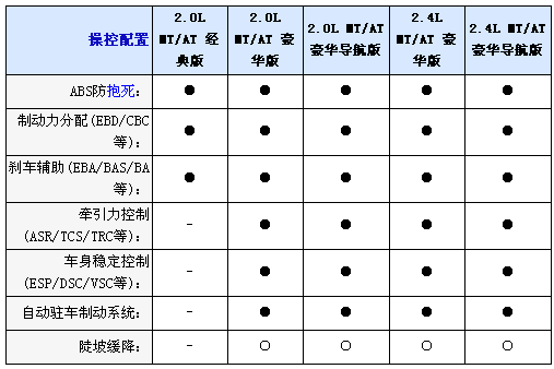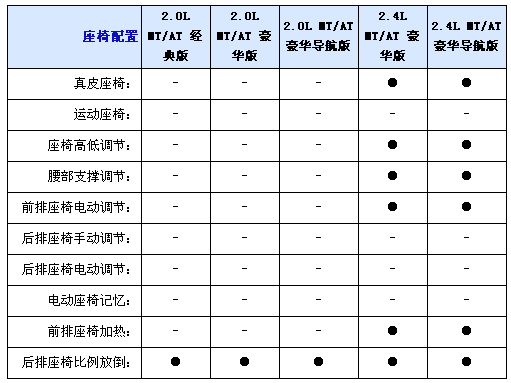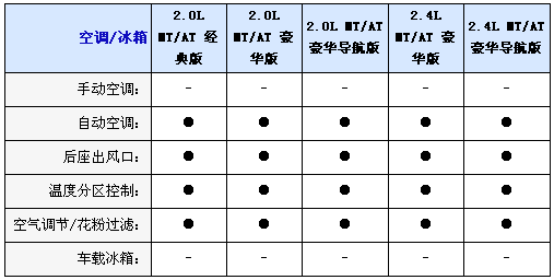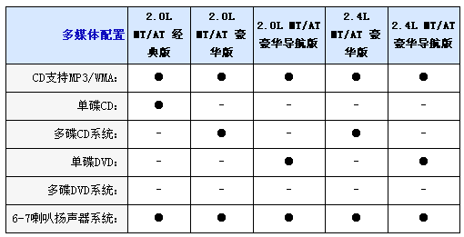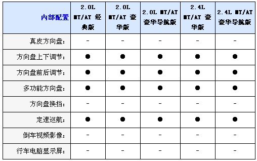 內(nèi)飾方面2.0L均配備織物座椅,而2.4L車型則采用真皮坐椅并且配備電加熱座椅,并且2.0L配備6向手動調(diào)節(jié)駕駛座椅,而2.4L配備8向電動調(diào)節(jié)并且代腰部支撐的駕駛座椅,不過副駕駛?cè)囅抵粯伺?向手動調(diào)節(jié)座椅,另外入門級車型只配備CD播放器,2.0L和2.4L豪華型采用6CD播放器,而2.0L和2.4L豪華導(dǎo)航型配備DVD播放器和6.5寸寬屏液晶顯示器;包括導(dǎo)航功能,全系標配6喇叭揚聲器、多功能方向盤自動分區(qū)空調(diào)和后排足部出風(fēng)口。