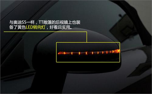 在車頭大燈下使用LED裝飾燈大獲成功之后,奧迪在TT敞篷的后視鏡上亦裝備了黃色的LED轉(zhuǎn)向燈,在夜間行駛時(shí)作用很大。