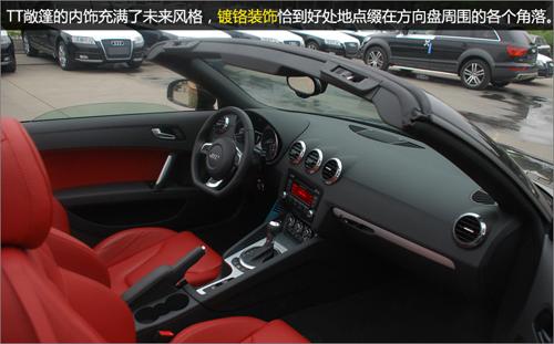 TT的內(nèi)飾采用了大量的鋁合金飾板,整個車室彌漫著金屬美感?照{(diào)出風(fēng)口、儀表盤和其他按鍵均以圓形為基調(diào),藉以和圓滑的外形相呼應(yīng)。這些一絲不茍的設(shè)計充分顯示出其出類拔萃的名門風(fēng)范。