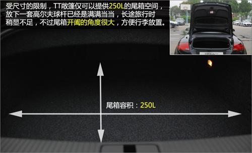 受到車身和軸距尺寸的限制,TT敞篷僅可以提供250L的尾箱空間,與奔馳SLK相比,少了50L。放下一套高爾夫的球桿已經(jīng)是滿滿當(dāng)當(dāng),長途旅行時稍顯不足。不過尾箱的開闔角度很大,方便行李的放置。