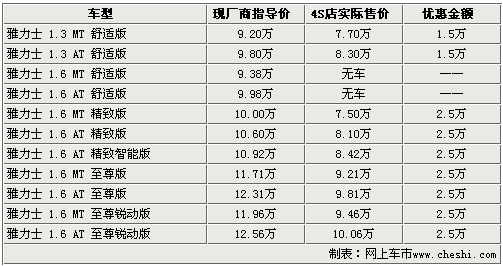 據(jù)廣州豐田4S店銷售人員介紹,目前廣州豐田各4S店內(nèi)雅力士1.3L現(xiàn)車較少,而1.6排量的車型就相對(duì)比較充足,并可提供試乘試駕服務(wù)。銷售人員表示,現(xiàn)在到店購買雅力士的消費(fèi)者可享受到最高達(dá)2.5萬的價(jià)格優(yōu)惠,還可得到商家贈(zèng)送的簡單裝飾等。消費(fèi)者可在展廳內(nèi)近距離接觸展車、親身體驗(yàn)試駕車后直接購買現(xiàn)車。