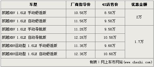 據(jù)經(jīng)銷商處銷售人員介紹,凱越HRV共有6個車型在售,近期除了舒適版現(xiàn)金優(yōu)惠仍然是2萬元外,其他4款車型的優(yōu)惠都上升到了1.7萬元。入門車型的凱越HRV 1.6LE 手動舒適版現(xiàn)金優(yōu)惠售價仍為8.58萬元。而導航版與運動版車型優(yōu)惠金額都從1.6萬元漲到了1.7萬元,但是此兩版車型店內(nèi)均無現(xiàn)車,欲購買的消費者需交訂金1萬元,最早兩周內(nèi)可以提車。