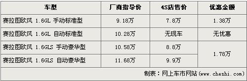 據(jù)經(jīng)銷商處銷售人員介紹,賽拉圖歐風(fēng)全系最高出現(xiàn)1.78萬元的優(yōu)惠。賽拉圖歐風(fēng)在售的有4個車型,入門級的1.6L手動標(biāo)準(zhǔn)版經(jīng)1.38萬元的優(yōu)惠后,售價從廠商指導(dǎo)價9.18萬元降到7.8萬元,1.6L豪華版的手動版和自動版車型都經(jīng)全系最高1.78萬元優(yōu)惠后,售價分別降至8.8萬元和9.9萬元。經(jīng)銷商處銷售人員還介紹,由于1.6L自動標(biāo)準(zhǔn)型沒有現(xiàn)車所以沒有在此次優(yōu)惠的列隊中,其他車型店內(nèi)現(xiàn)車充足。