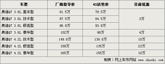 據(jù)奧迪4S店銷(xiāo)售人員介紹,目前銷(xiāo)售的奧迪Q7包括了3.6和4.2排量共7款車(chē)型。消費(fèi)者在購(gòu)買(mǎi)的同時(shí)可以選擇個(gè)性化選裝配置,其中包括了座椅顏色,內(nèi)飾顏色,剎車(chē)盤(pán),音響等一系列配置,據(jù)介紹,選擇個(gè)性化配置后,車(chē)價(jià)將有相應(yīng)增加。同時(shí)消費(fèi)者可以直接購(gòu)買(mǎi)原車(chē)型,目前全車(chē)系3.6排量三款車(chē)優(yōu)惠3萬(wàn)元現(xiàn)金,豪華版優(yōu)惠4萬(wàn)。而4.2舒適型最低可優(yōu)惠到135萬(wàn),降幅達(dá)23萬(wàn)。目前4S店現(xiàn)車(chē)主要以黑色為主,內(nèi)飾有灰色、米色可供選擇。