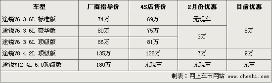 筆者從進(jìn)口大眾經(jīng)銷(xiāo)商處了解到,相比2月份途銳的優(yōu)惠幅度,目前優(yōu)惠有進(jìn)一步加大,其中途銳V6三款車(chē)優(yōu)惠現(xiàn)金5萬(wàn)元,而途銳4.2L頂級(jí)版則優(yōu)惠9萬(wàn)元現(xiàn)金,比上月優(yōu)惠幅度均增加2萬(wàn)元。但據(jù)4S店銷(xiāo)售人員介紹,目前3.6標(biāo)準(zhǔn)版和6.0頂級(jí)版尚沒(méi)有現(xiàn)車(chē),其他各款有黑色和銀色可選擇,但數(shù)量非常少。在內(nèi)飾顏色方面,途銳有米黃色、灰色、黑色和棕色四款可供選擇,而一般大眾顏色為米黃和灰色。近期,途銳將有部分新車(chē)到店,消費(fèi)者可到4S店看車(chē)試駕。