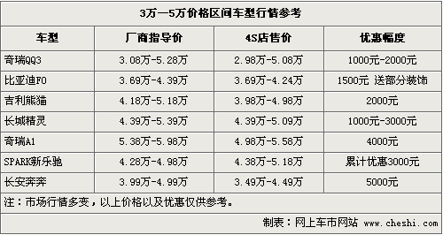 據(jù)4S店銷售人員介紹,目前QQ3的優(yōu)惠幅度在1000元-2000元之間,優(yōu)惠形式各4S店有一定的差別,主要以現(xiàn)金優(yōu)惠和贈(zèng)送裝飾為主。目前最QQ3最便宜車型價(jià)格已經(jīng)不足3萬元,最為一款都市時(shí)尚代步工具而言,這樣的價(jià)格非常的實(shí)惠,F(xiàn)車方面,QQ3有多種顏色可選,消費(fèi)者可到店看車選購(gòu)。