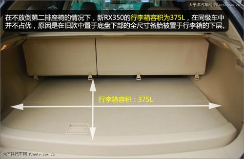 在不放倒第二排座椅的情況下,新RX350的行李箱容積為375L,在同級車中并不占優(yōu),原因是在舊款中置于地盤下部的全尺寸備胎被置于行李箱的下層。這樣設計的優(yōu)點就是讓司乘人員可以在車輛需要更換輪胎的時候,不至于要趴在徹底拆卸備胎。目前,越來越多的城市SUV采用這樣的設計。