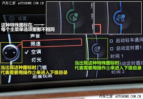 當(dāng)我們進(jìn)入“設(shè)置”選項(xiàng)的二級(jí)目錄時(shí),在二級(jí)目錄的左右兩邊我們可以看到兩種不同的圖標(biāo)。左邊的圓形帶有兩個(gè)小箭頭的圖標(biāo)表示如果想進(jìn)入左側(cè)的上級(jí)目錄需要使用②撥動(dòng)方式向左撥動(dòng)旋鈕進(jìn)入,而右邊的特殊圖標(biāo)表示如果想進(jìn)入右側(cè)的下級(jí)目錄需要使用③向下按的方式進(jìn)入。總的來(lái)說(shuō),這種左右分列的目錄形式比老款要更符合人們的日常習(xí)慣,因此比老款iDrive系統(tǒng)更容易得到用戶的認(rèn)可。