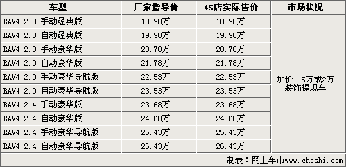 2009年4月10日,一汽豐田正式推出了首款SUV車(chē)型RAV4,售價(jià)18.98-26.43萬(wàn)元。作為一款日系經(jīng)典城市SUV車(chē)型,起初以進(jìn)口方式銷(xiāo)售時(shí)就得到了廣大消費(fèi)者的喜愛(ài),此次國(guó)產(chǎn)后由于價(jià)格較進(jìn)口車(chē)型有所降低,進(jìn)一步提升了RAV4的性?xún)r(jià)比。那么剛剛上市RAV4的市場(chǎng)狀況究竟如何呢?記者在走訪北京地區(qū)一汽豐田4S店時(shí)了解到:目前國(guó)產(chǎn)RAV4現(xiàn)車(chē)現(xiàn)已到店,但是由于貨源比較緊張,消費(fèi)者需要加價(jià)1.5萬(wàn)元或2萬(wàn)元裝飾才可以提到現(xiàn)車(chē)。具體車(chē)型售價(jià)見(jiàn)下表: