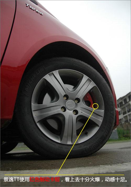 來到景逸TT的尾部,我們知道之前的版本后尾箱兩側(cè)紅色部分是起到裝飾作用,踩下制動板兩邊只有下面兩盞小燈亮起,讓人感覺廠家既然設(shè)計出來為何不用呢?當(dāng)時廠家并沒有給出正面回答,但是今天的TT版本將這樣的疑惑解答,LED后尾燈全部亮起,就算是白天也十分明顯,提醒后面車主與之保持安全距離。國產(chǎn)車?yán)锩嬗羞@么大尾燈的還是第一次看見,這可以說是該產(chǎn)品的一個大的亮點之一。新增的“1.8T”的標(biāo)識顯示了“景逸TT”的出眾與不同,再加上有意更換的前后四輪紅色剎車鉗,撲面而來的力量感使人頓生駕馭的沖動。