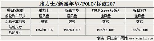 四款車型的前后剎車形式都是通風(fēng)盤+蹄鼓式剎車,輪胎尺寸方面新建年華運動版和POLO Sporty兩款用到了更大的16寸輪胎并且寬度也更寬,非常符合這兩款車型突出運動性的定位。而雅力士和標(biāo)致207的15寸車輪配合185輪胎寬度在同級別車型中也是中規(guī)中矩的配置。