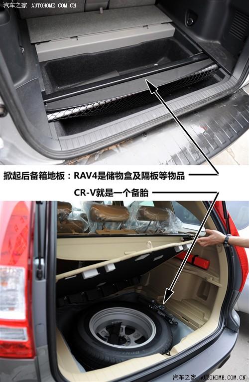 先開后備箱地板之后,對(duì)比也是明顯的,CR-V一個(gè)赤裸裸的備胎完全占領(lǐng)了地板下空間,RAV4比較體貼的設(shè)計(jì)了儲(chǔ)物盒等諸多空間。