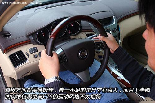 接著轉(zhuǎn)向車內(nèi)看看,真皮方向盤手感極佳,唯一不足的是尺寸有點大,而且上半部的實木包裹也與CTS的運(yùn)動風(fēng)格不太相符。變速器換擋桿短小精干,操作起來十分順手,不過我們同樣認(rèn)為作為一部運(yùn)動車型,換擋桿不應(yīng)該用實木的,而應(yīng)該用皮質(zhì)或金屬的。