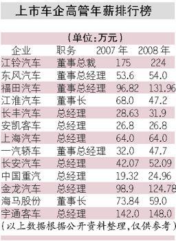 4月底所有上市車企披露了2008年年報(bào),高管薪酬也浮出了水面。2008年并不算是個(gè)好的年份,上半年市場(chǎng)尚好但遭遇了成本高漲的壓力,下半年市場(chǎng)急劇降溫,企業(yè)利潤也快速下滑。但上市公司高管的薪酬基本上還是穩(wěn)中有升,當(dāng)然,與2007年同比2006年的大幅增長不可同日而語。商用車企業(yè)的薪酬要遠(yuǎn)高于乘用車車企高層,高管薪酬超過100萬元的全是商用車企業(yè)。