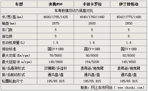 一汽奔騰新款轎車-B50即將在5月16日正式上市,作為向下擴展的重要車型,它被一汽寄予了很大的期待。而在同級市場當中還有很多1.6車型很具有競爭力,比如日系的卡羅拉以及韓系的伊蘭特悅動。作為國產(chǎn)車的奔騰B50到底與這些車型相比有那些優(yōu)勢呢?這里就將這款即將上市的新車與他們做一個詳細的配置對比,看看三款車型到底區(qū)別在那里。