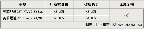 筆者從英菲尼迪北京地區(qū)經(jīng)銷商處了解到,目前英菲尼迪G37銷售的車型包括四門版和兩門版車型,售價為48.3萬和66萬,F(xiàn)在消費者購車的話可以優(yōu)惠2萬元的現(xiàn)金,優(yōu)惠后售價為46.3萬元。這款車有銀色、黑色、紅色、白色/藍(lán)色等可提供給消費者選擇,購車的消費者可到店具體咨詢。